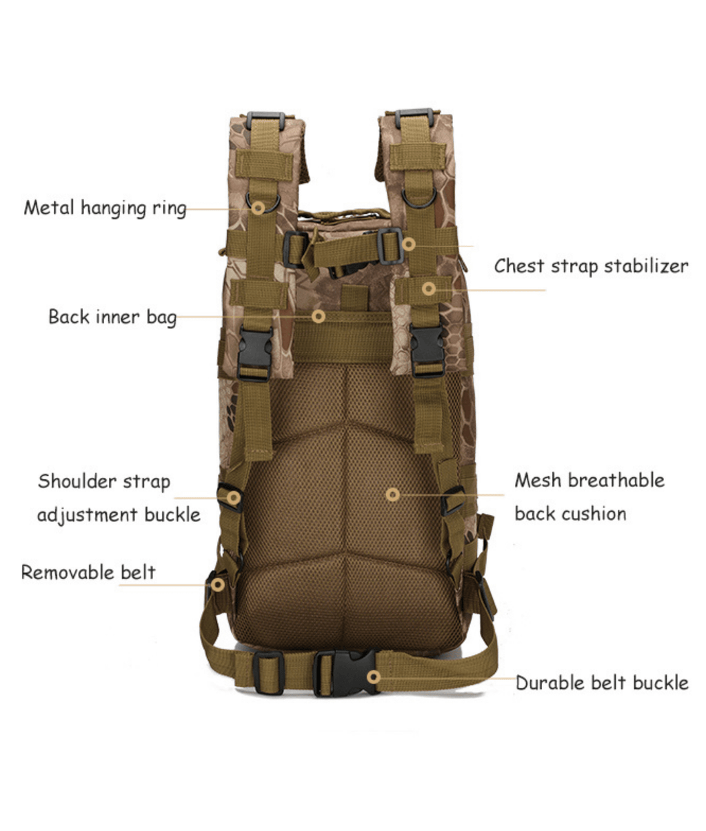 This all-purpose, durable outdoor tactical bag allows outdoor enthusiasts to comfortably carry essentials and more with its multi-compartment design. The durable fabric ensures high performance and the mesh backing allows breathability in warmer temperatures. The main compartment is spacious and zips close and includes both mesh compartments and additional front storage zip-up compartments. The padded shoulder straps help relieve pressure on shoulders making carrying heavy loads more comfortable and secure.