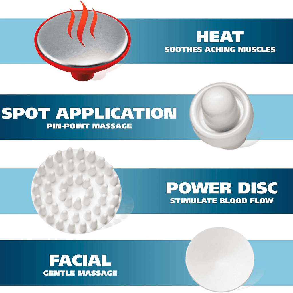 - 4 Unique Attachment Heads – Heat Disc for soothing aching muscles, Spot Application head for pin-pointing targeted muscle knots, Power Disc head for stimulating healthy blood flow, and a Facial attachment head for gentle facial and neck massages