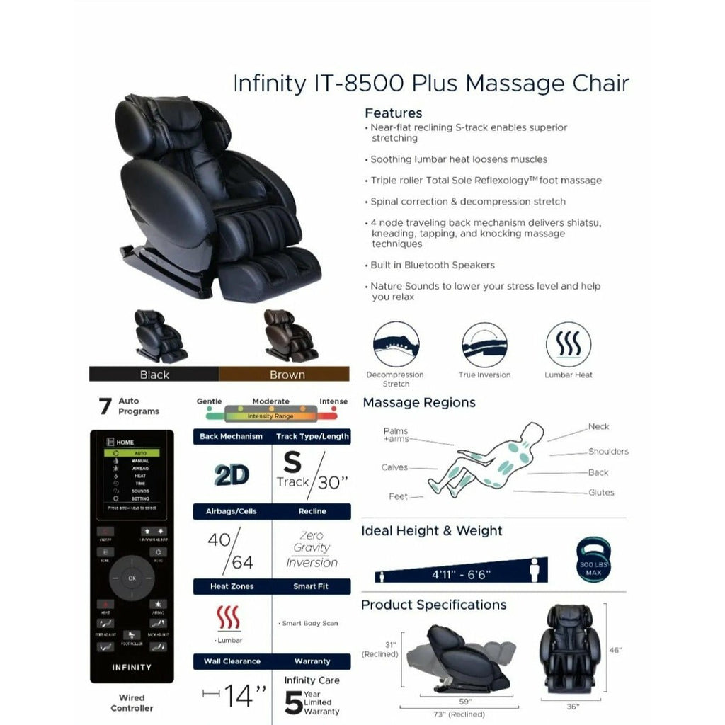 • Infinity felt it was time to upgrade one of our most popular massage chairs, the result of which is the IT-8500 Plus. Now featuring a color screen LCD remote, app functionality, and in-built nature sounds, this chair appeals to even more lifestyles and body types. Users can seamlessly play their favorite tunes through the chair's Bluetooth®-enabled sound system. Plus, the Apple® and Android™ app allow you to easily control your massage from your device.