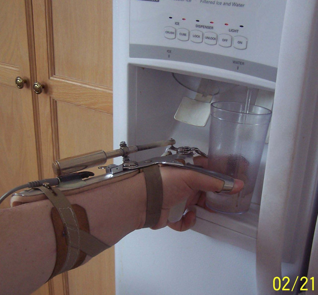 I just wanted to thank you so much for the unbelievably thoughtful gifts that you sent me . Thanks for all the everyday utensils I can now use! This Grip and the tools work amazing. I have it set up just like I envisioned! By the end of the first day I was comfortable wearing, and functioning with the grip. Moving my arm around was no problem at all. I just need a little practice hitting the buttons that are set up perfect for me. Eating something as tricky as soup is already second nature. Now with the added rubber grippers, my life is even easier! I can grab items on my own with no problem.