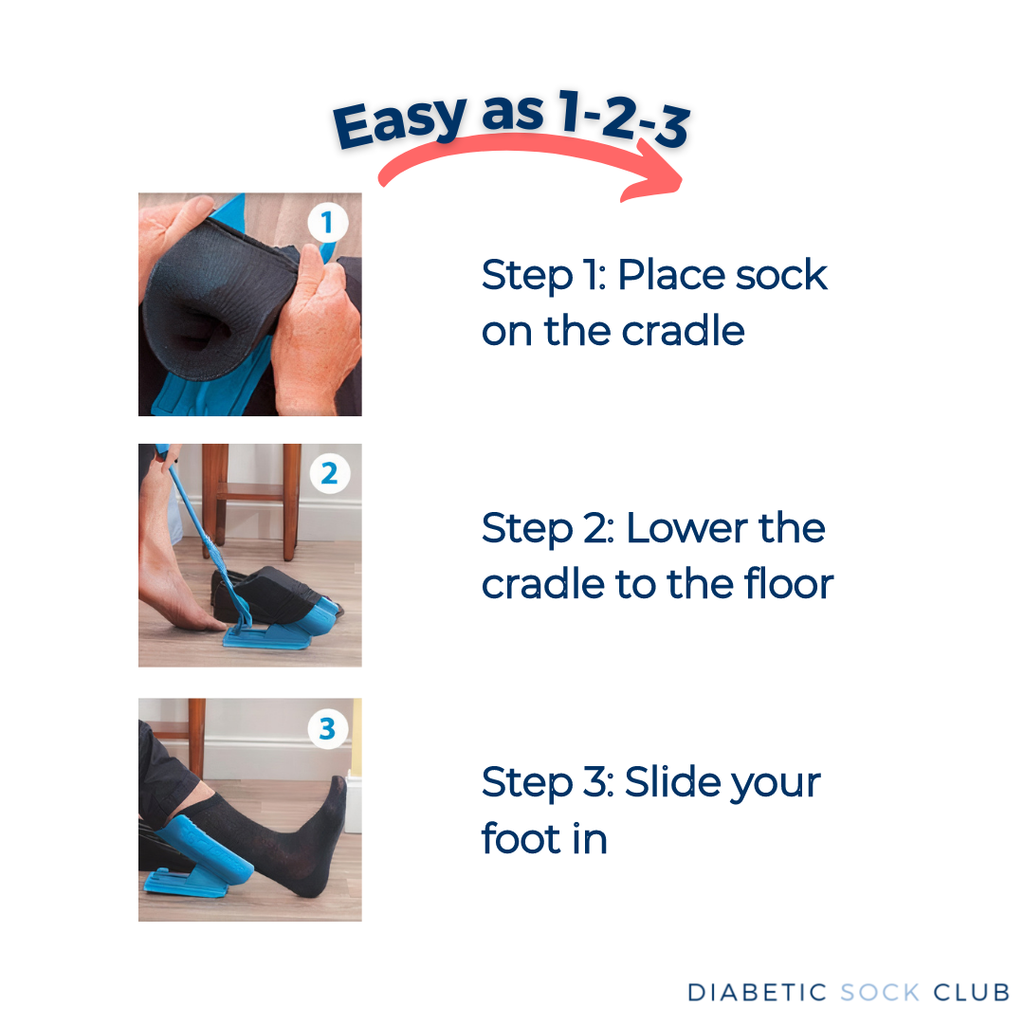 DSC Sock Aid Slider Kit (Easy On, Easy Off)  includes a sock cradle and a long handle that allows you to put your socks on without bending, twisting, or turning. The handle will also assist you in removing your socks when you're through wearing them and holding your shoes in position while putting them on. This technique works with a variety of socks, including formal socks, casual socks, athletic socks, compression socks, and of course, diabetic socks.