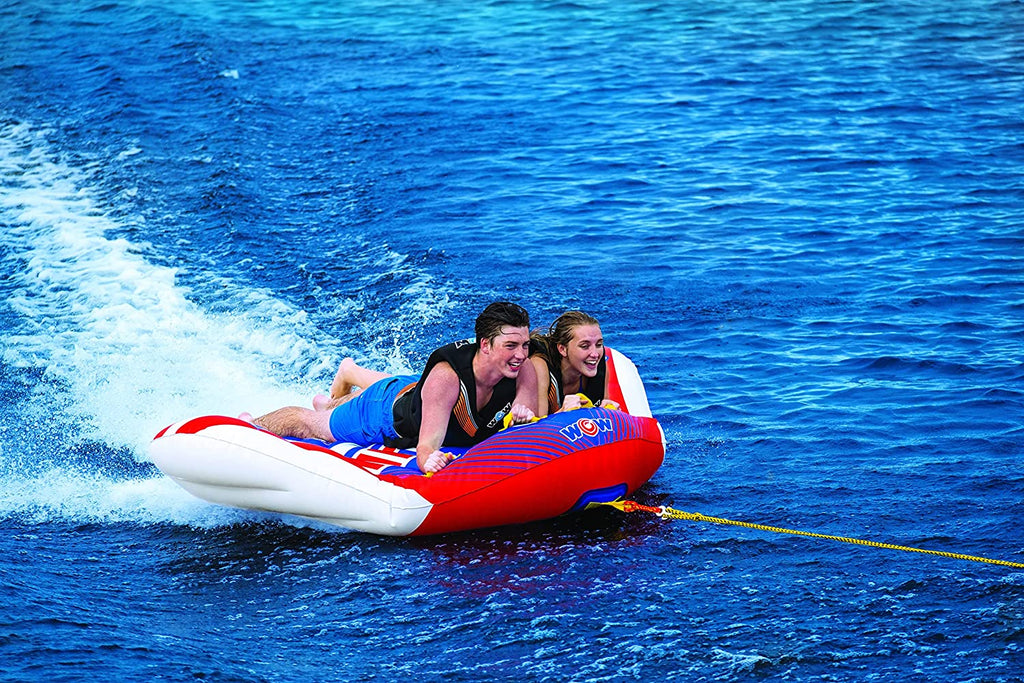 This two-person javelin is ready to fly. Its aerodynamic shape is higher in the front than the back, and helps you and bud hold on tight to enjoy a wild ride with whips and turns. It's made of heavy-duty PVC and high-visibility graphics for durability (and so you can show off on the water). We also included double webbing foam handles with knuckle guards to help you hold on tight when speeds ramp up. The reinforced tow point provides an extra secure attachment to the boat, too. Maximum capacity 340 lbs. Includes a one-year warranty.