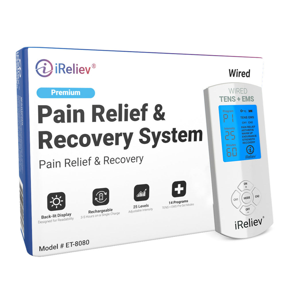 iReliev's best-selling 2-in-1 Pain Relief and Recovery System just got better, combining the best features of our previous TENS + EMS system but with the added benefits of rechargeability, backlit, and extra-large digital display.