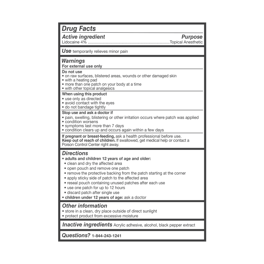 Patch Info: Lidocaine 4% 3” x 5” patch, 20 per resealable pouch