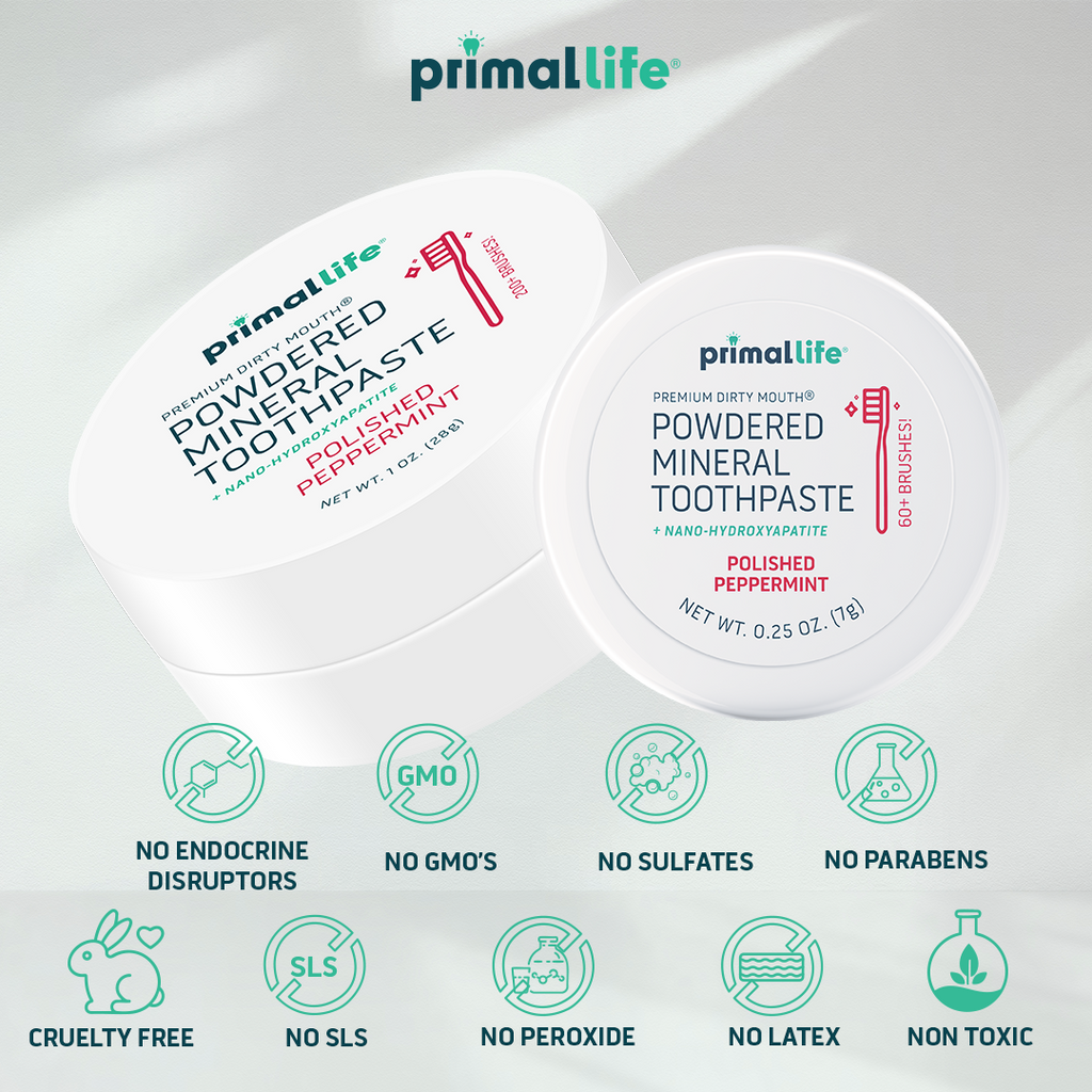 The Primal Life Organics Dirty Mouth Toothpowder is a bestseller for a reason! It’s formulated with cleansing, mineral-rich bentonite, kaolin, french green clays, and nano-hydroxyapatite to clean, whiten, and remineralize your teeth, so they are stronger, leaving you with an alkaline mouth that is resistant to cavities!