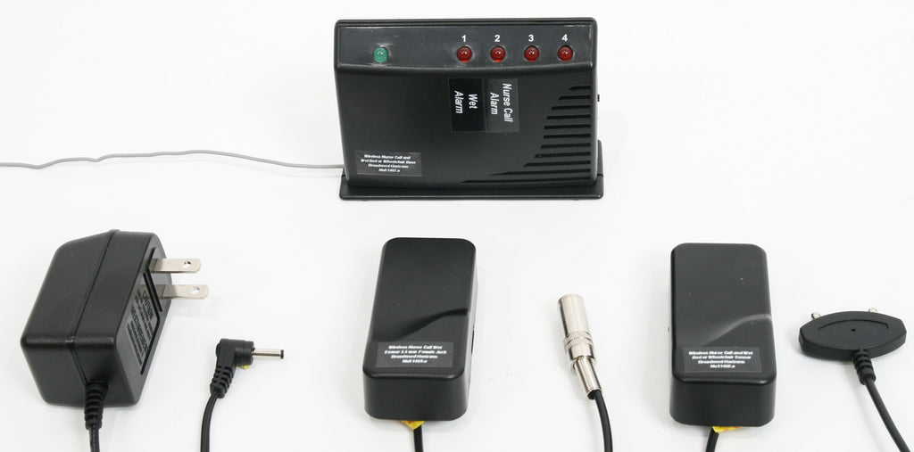 Wireless transmitters allow caregivers to know the nature of the problem based on which LED is activated on the base station. Add wireless nurse call to shower and toilet. Add moisture sensing and nurse call to a favorite recliner. Wheelchair users can be mobile and request help from anywhere in the building (within range).