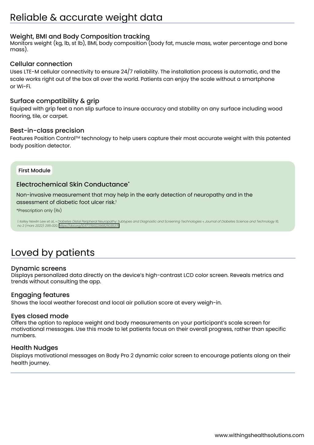 Pioneering a modular approach, Body Pro 2 is the first and only scale to introduce breakthrough measurements that enables care teams to manage various chronic conditions, starting with a module to help prevent diabetic foot ulcers.