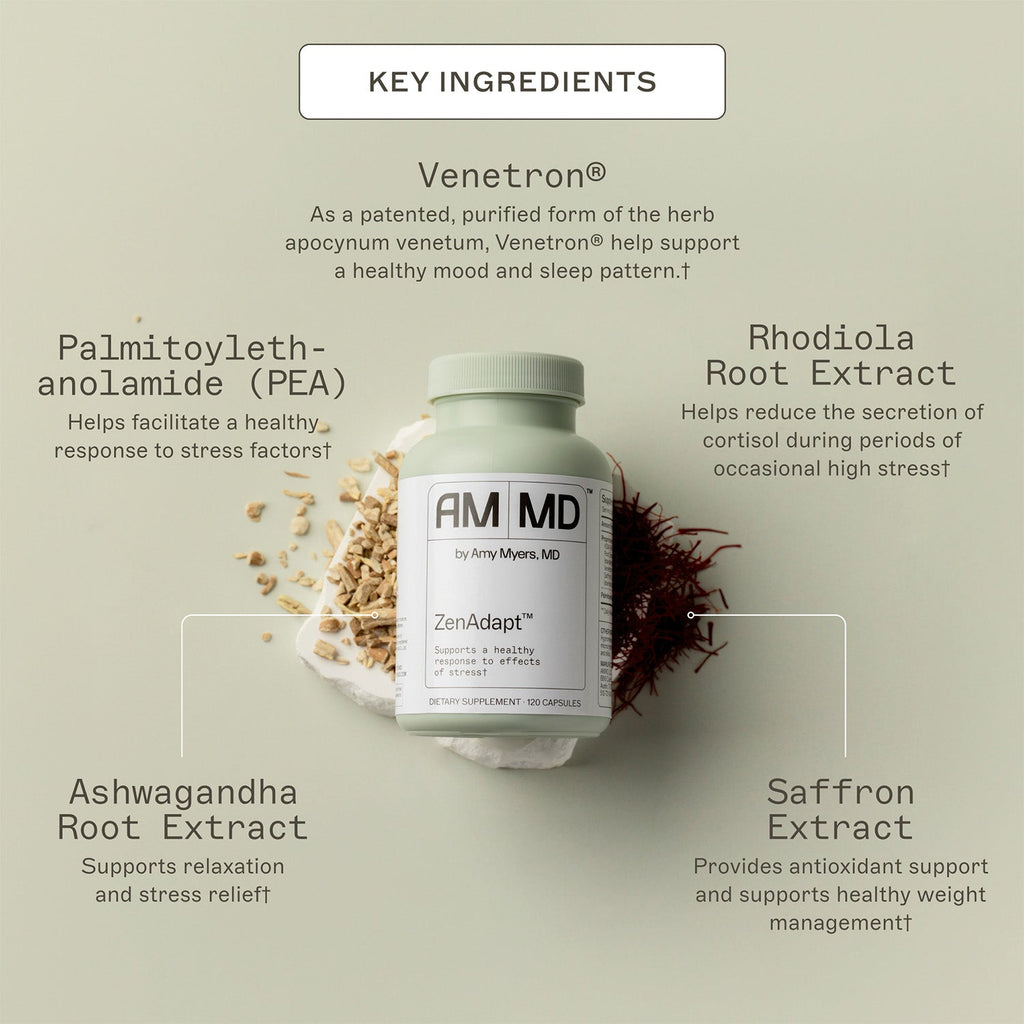 ZenAdapt™ contains adaptogenic herbs, botanicals and PEA for supporting healthy cortisol levels and a balanced stress response. That way, you can mitigate the overproduction of the stress-response chemicals that keep you tossing and turning at night. Want to wind down in a healthy way? Simply take ZenAdapt™ in the afternoon to support a healthy night’s rest.†
