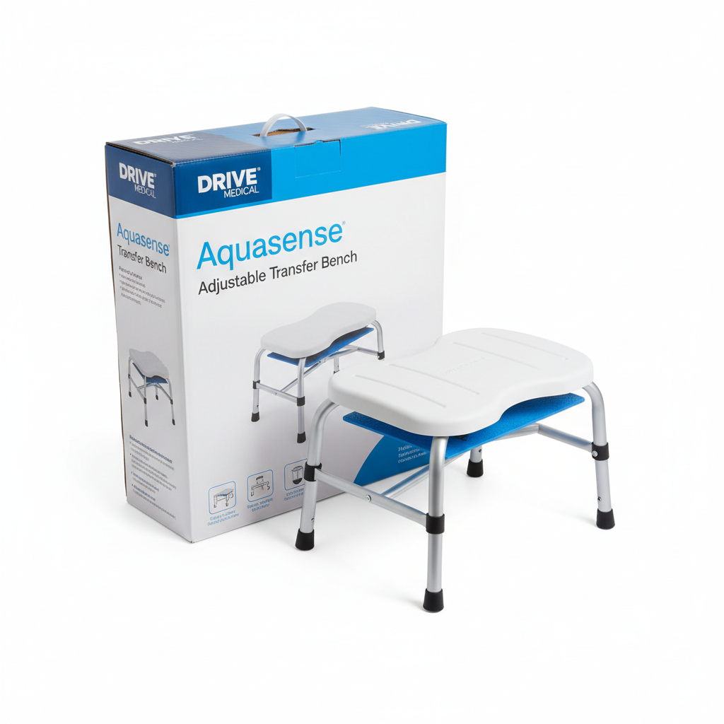 ספסל העברת האמבטיה המתכוונן, מבית AquaSense®, מופל ומעוצב. הוא בנוי עם מסגרת קלת משקל עמידה בפני חלודה. לרגלי ספסל ההעברה יש תשעה (9) התאמות במרווחים של 1.2 אינץ' כדי להתאים לגבהים שונים של אמבטיה.