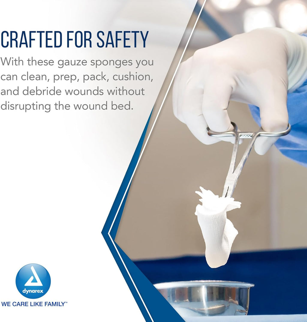 Dynarex Gauze Sponges & Pads are high-quality dressings made with 100% cotton materials for use in cleaning, dressing, and packing wounds.