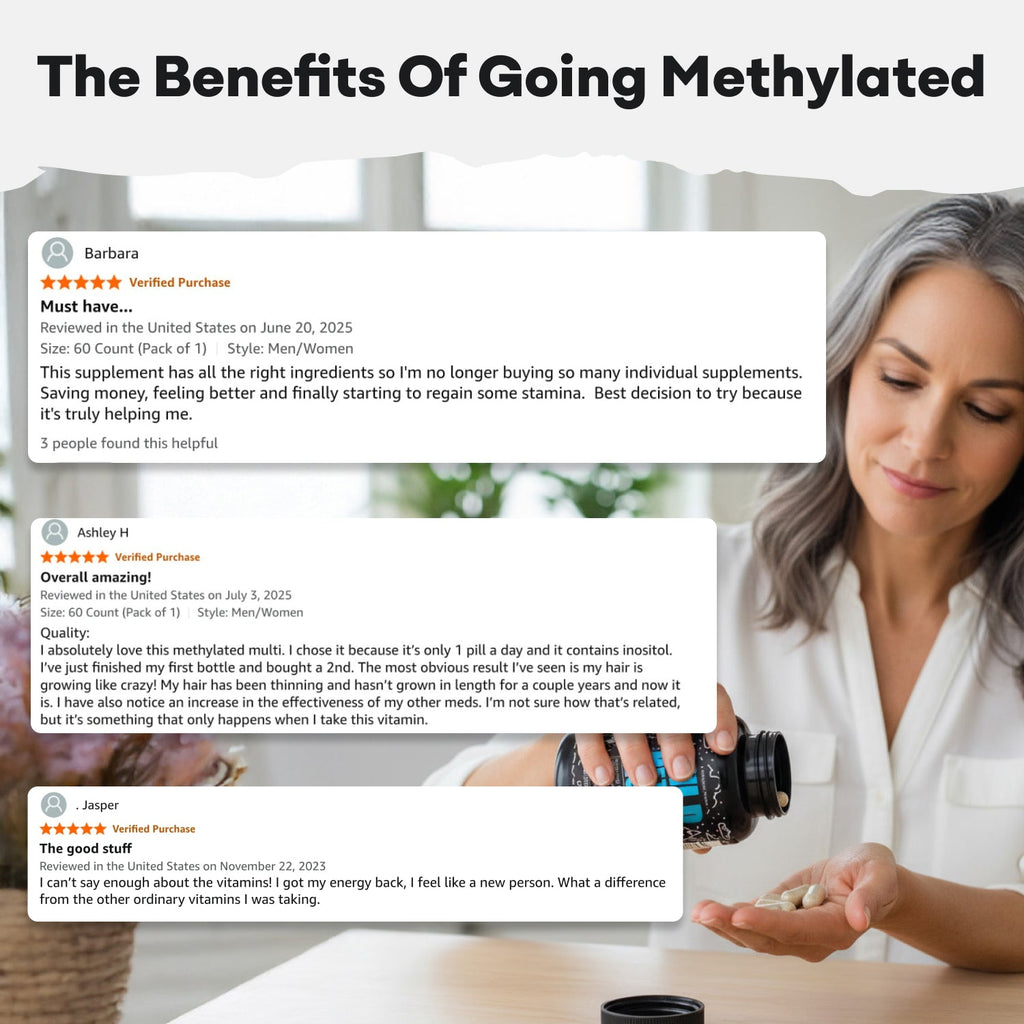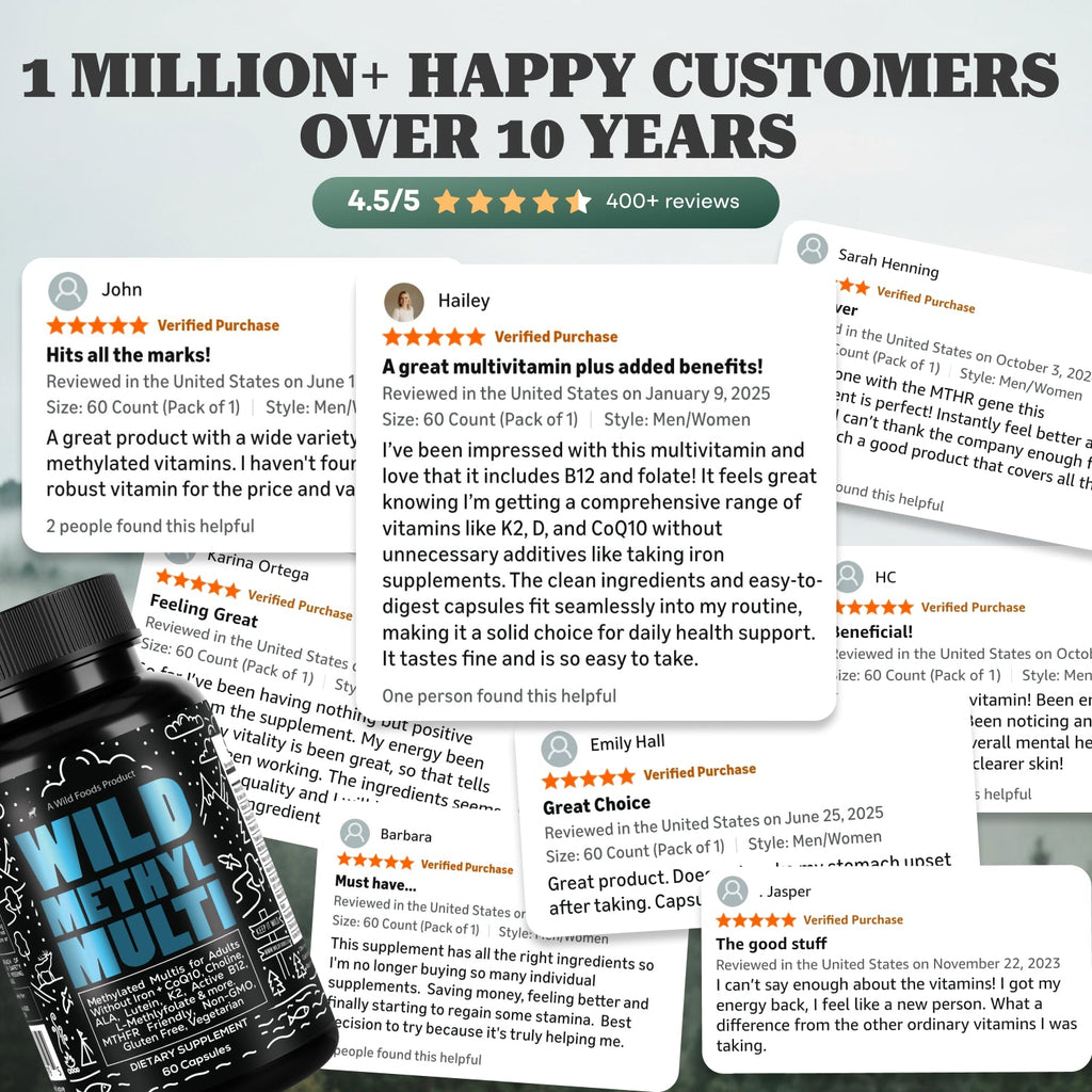 Support steady energy, a clear head, healthy hair/skin/nails, and everyday vitality— in one simple habit. Wild Foods Methyl Multi uses pre-converted (methylated), bio-ready B-vitamins—including L-5-MTHF (active folate) and methylcobalamin (active B12)—so your body can use them right away to support cellular energy, focus, mood, and immune health.