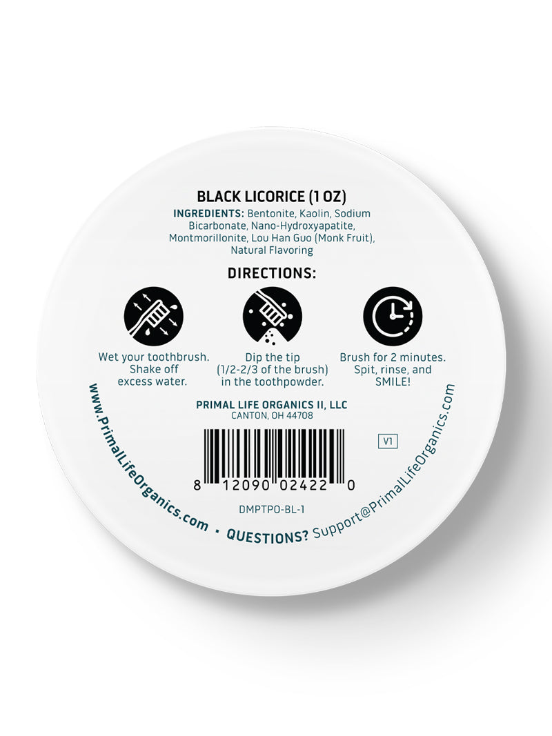 Black Licorice: Bentonite, Kaolin, Sodium Bicarbonate, Nano-Hydroxyapatite, Montmorillonite, Lou Han Guo (Monk Fruit), Natural Flavoring